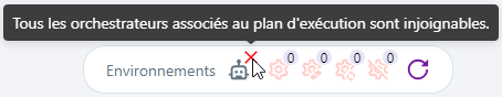 | Erreur | ![]() | Tous les orchestrateurs liés au plan de test sont injoignables : - Les URLs renseignées dans l'espace Administration> > Serveurs > Serveurs d'exécution automatisée ne permettent pas de joindre les orchestrateurs ou sont incorrectes. - Les jetons renseignés (côté projet, ou côté serveur) ne sont pas valides. - Les orchestrateurs sont arrêtés. |