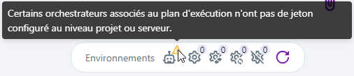 | Avertissement | ![]() | Le jeton d'un ou de plusieurs orchestrateurs n'est pas renseigné (ni au niveau projet, ni au niveau serveur automatisé). |